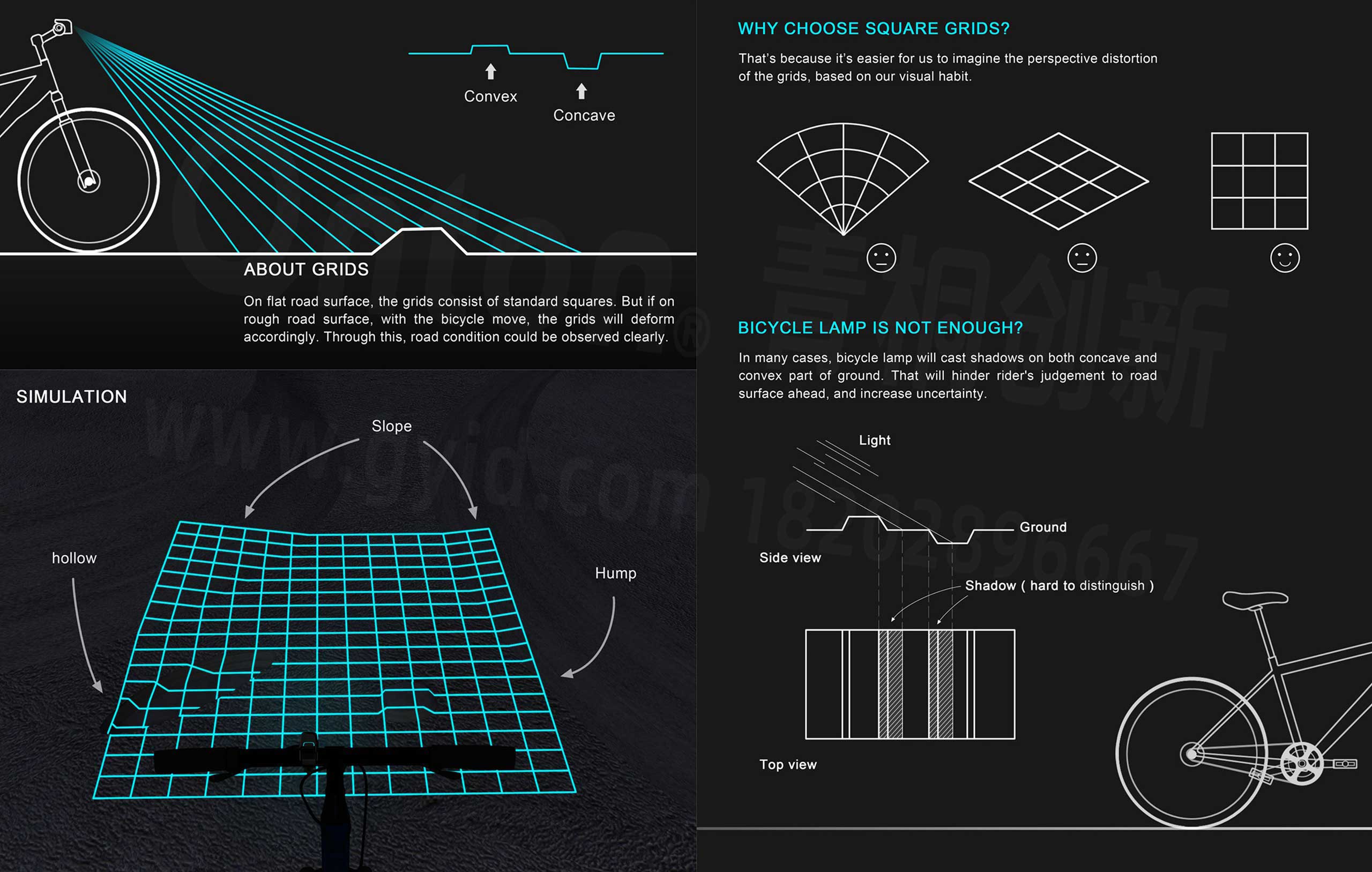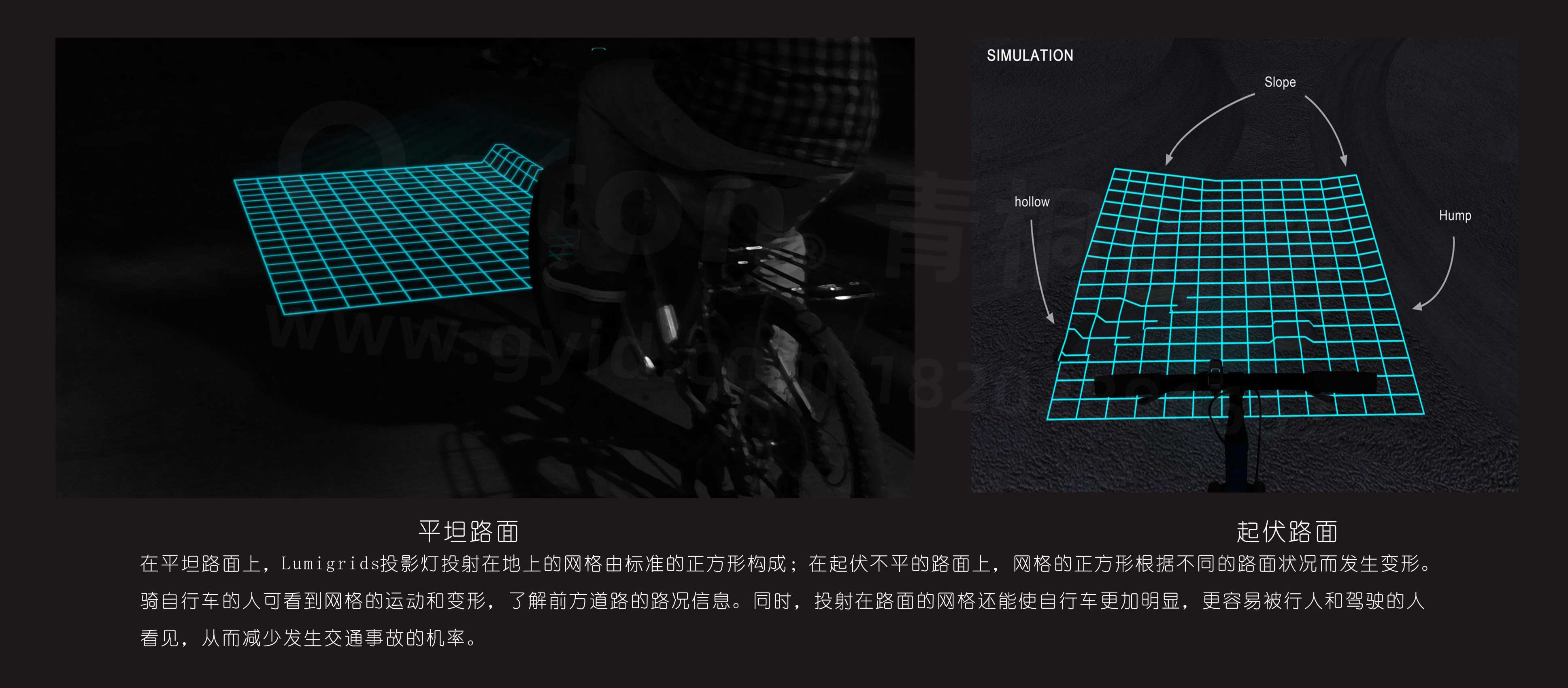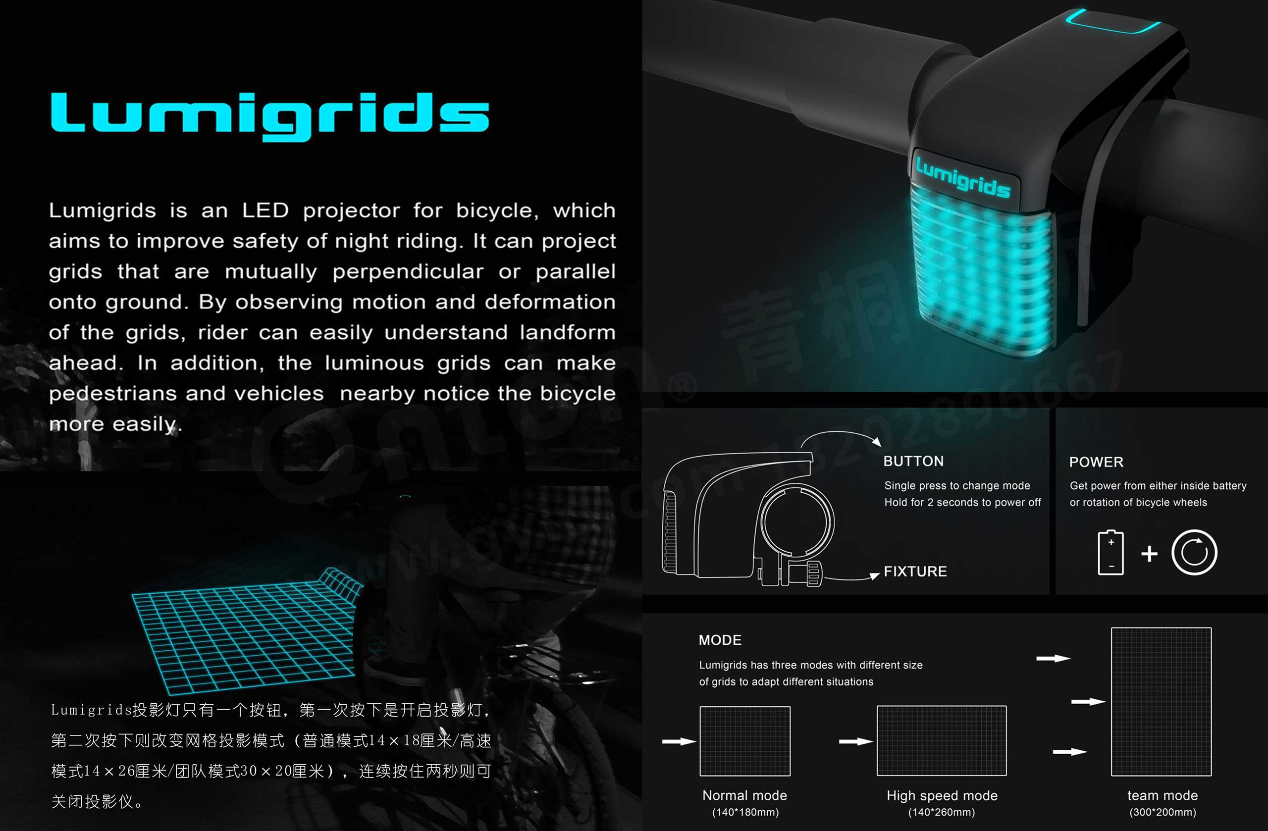 近年来越来越多的人开始使用自行车做为代步或健身工具,但是由于一些道路设施的不完善,在夜骑时往往看不清楚前方路况,造成安全事故频发。为此,青桐创新设计师创新设计出了一种可安装在自行车上的LED投影灯,帮助骑行者在夜晚更好地看清前面的路。