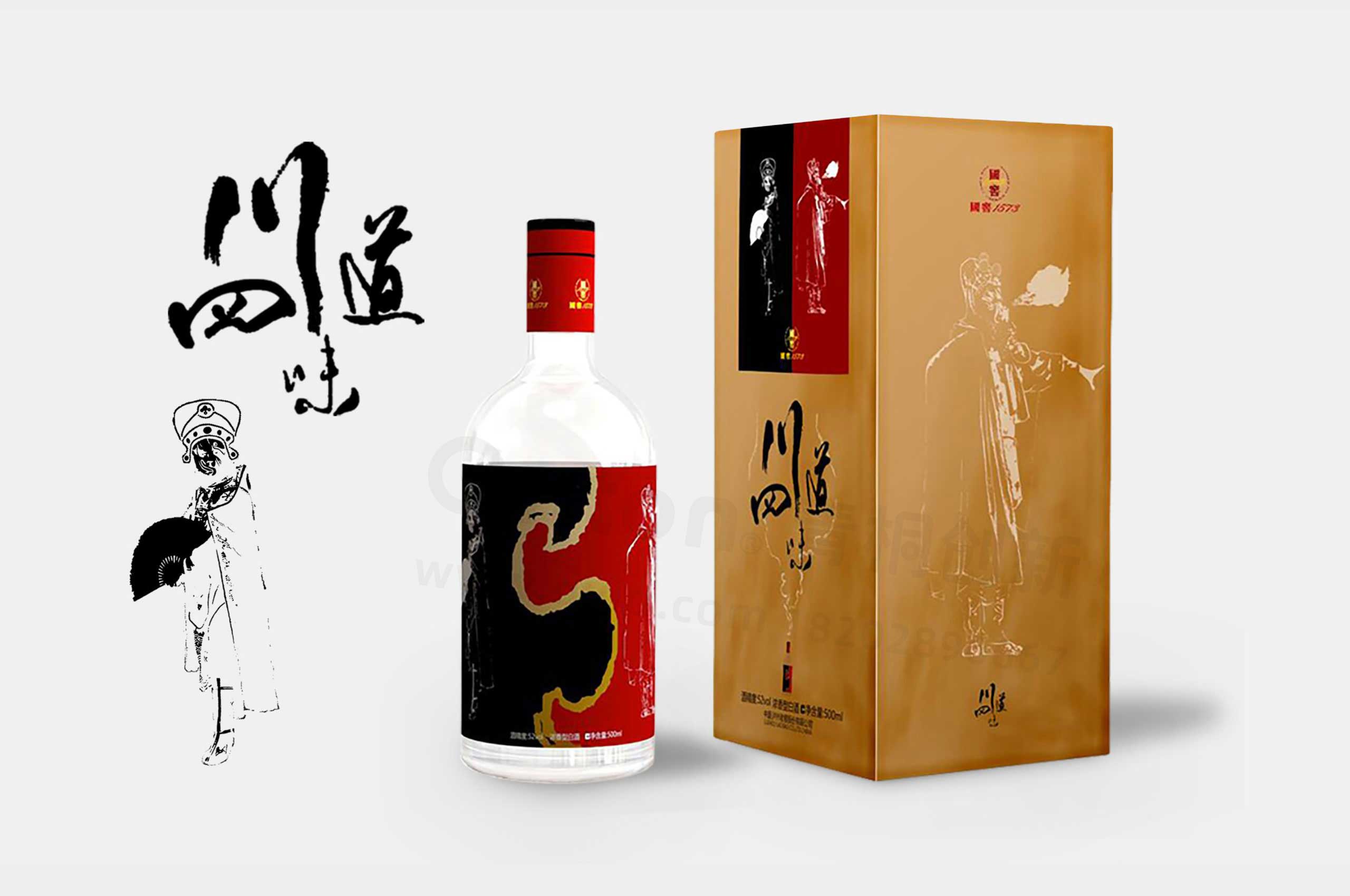 包装背景以泛黄的“宣纸”作为大色调,“黑和红”分别是川剧的变脸绝技和吐火绝技,酒盒顶盖和瓶贴正面酷似八卦图的纹样实则是把“八卦图”的中线换成了四川盆地内蜿蜒的“河流走势”,有了河才有水,水又是酒的灵魂,正是因为四川的好水才能酿造出如此美味的白酒。整个包装将显性元素的“川剧文化”和“中国书法”、隐性元素的“四川河流”和“八卦元素”融为一体,使之呈现出强烈的中国传统风格。