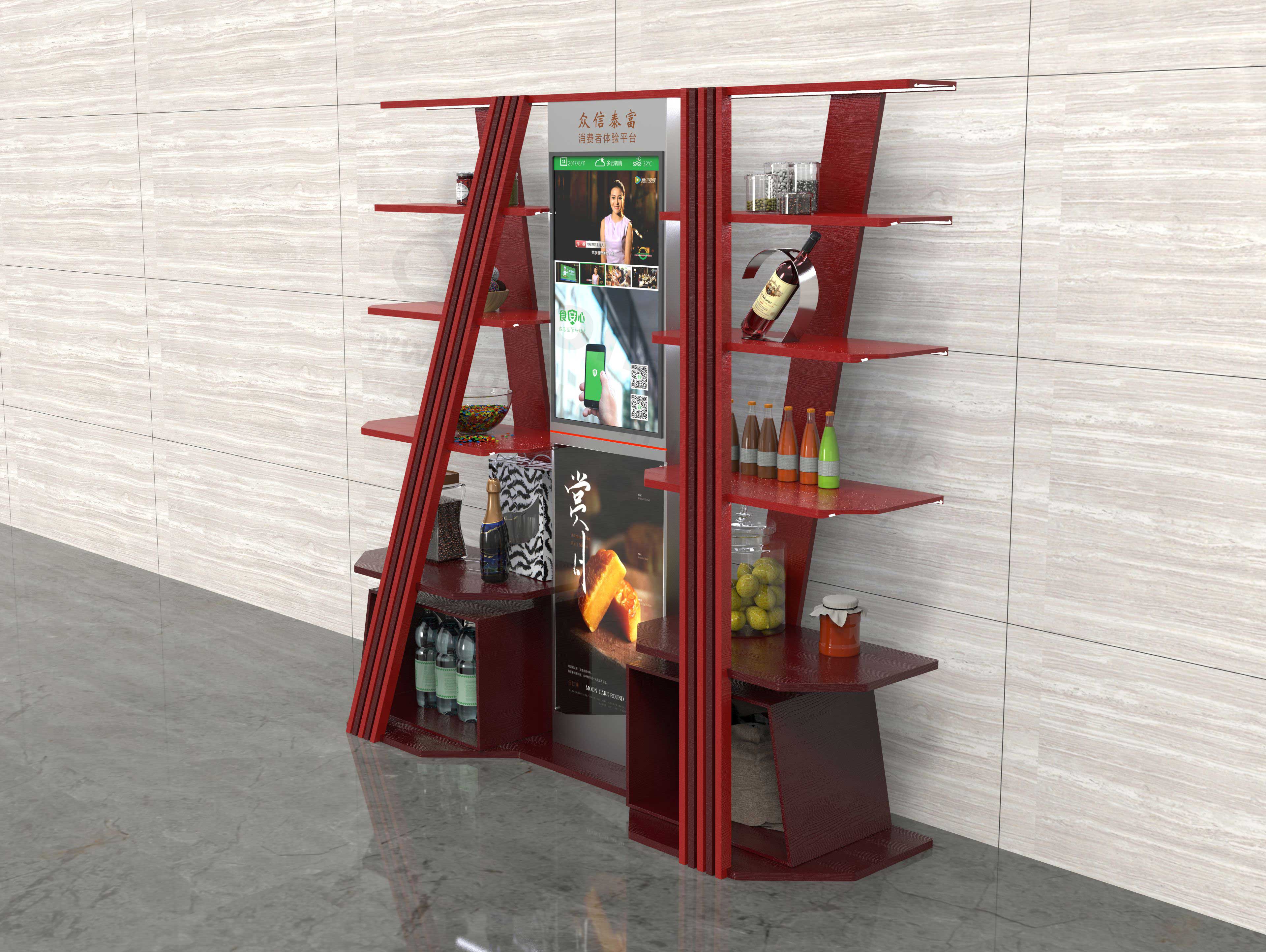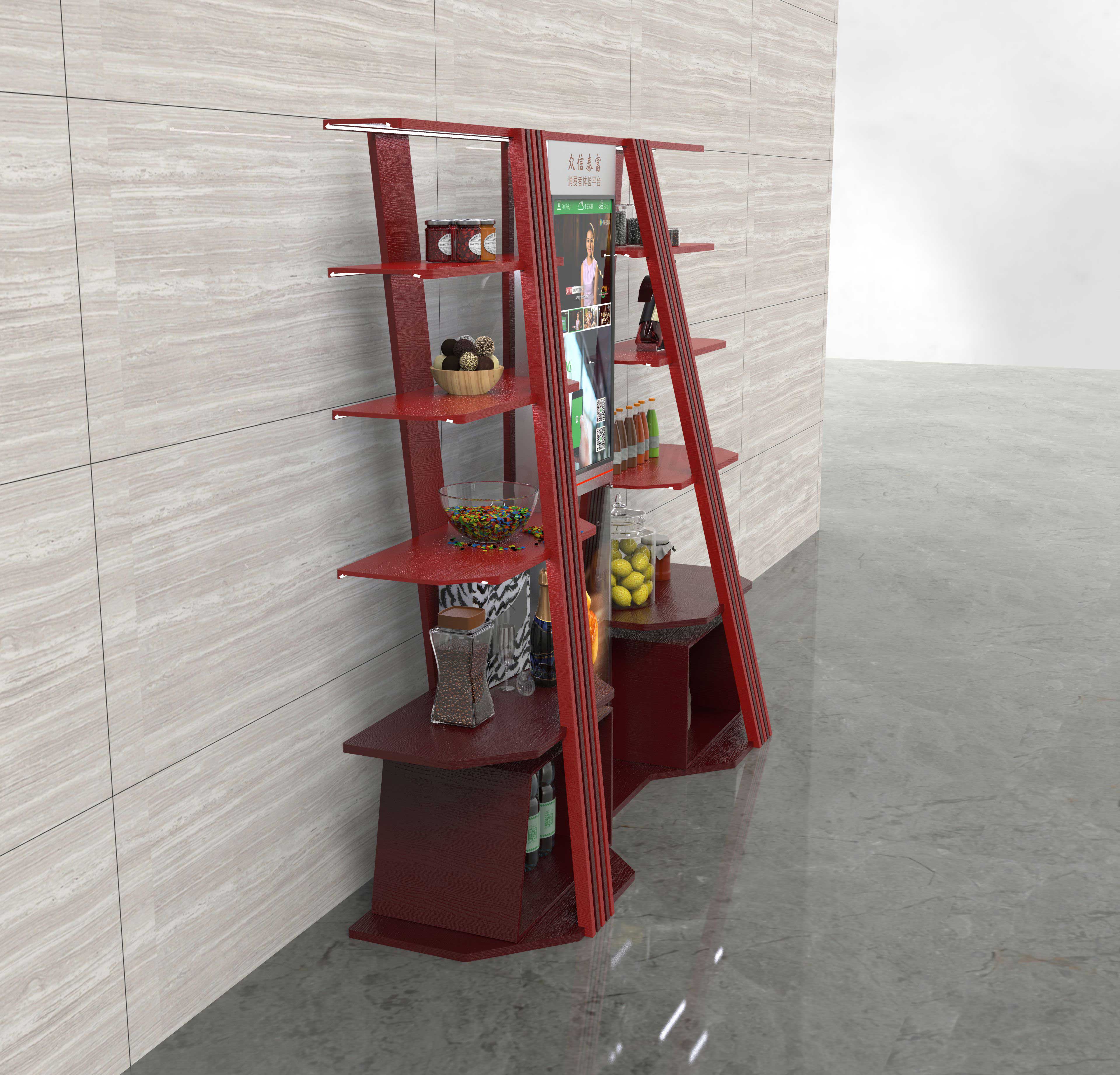 展示台采用木板拼接而成,开放式展示,用户可根据需要随意触摸产品、体验产品。在颜色搭配上,采用极具中国风的黑红搭配,符合中式饭店的环境,沉稳大气。