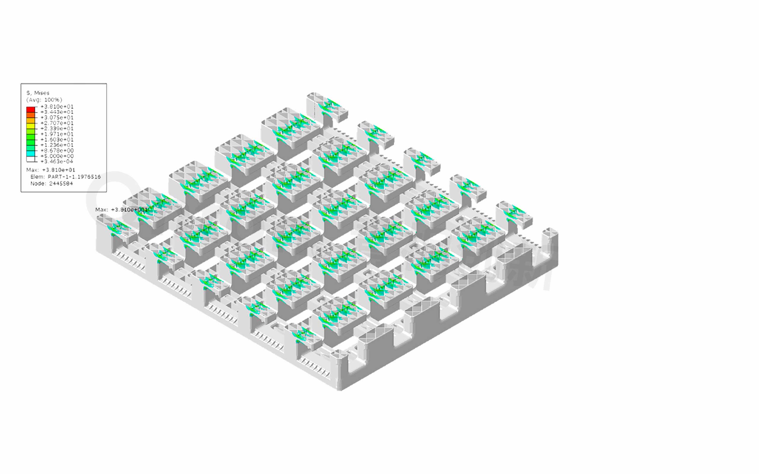 根据客户要求,塑料托盘按照以下分析(分析材料分别为:pa66+gf25/HDPE):1、动载分析(圆齿叉车移动承重托盘):圆齿直径60mm,间距为250mm,目标承重2吨,实际重物为袋装化工原料、肥料;2、静载分析(静止地面承重分析):目标承重6.5吨,重物为袋装化工原料、肥料。