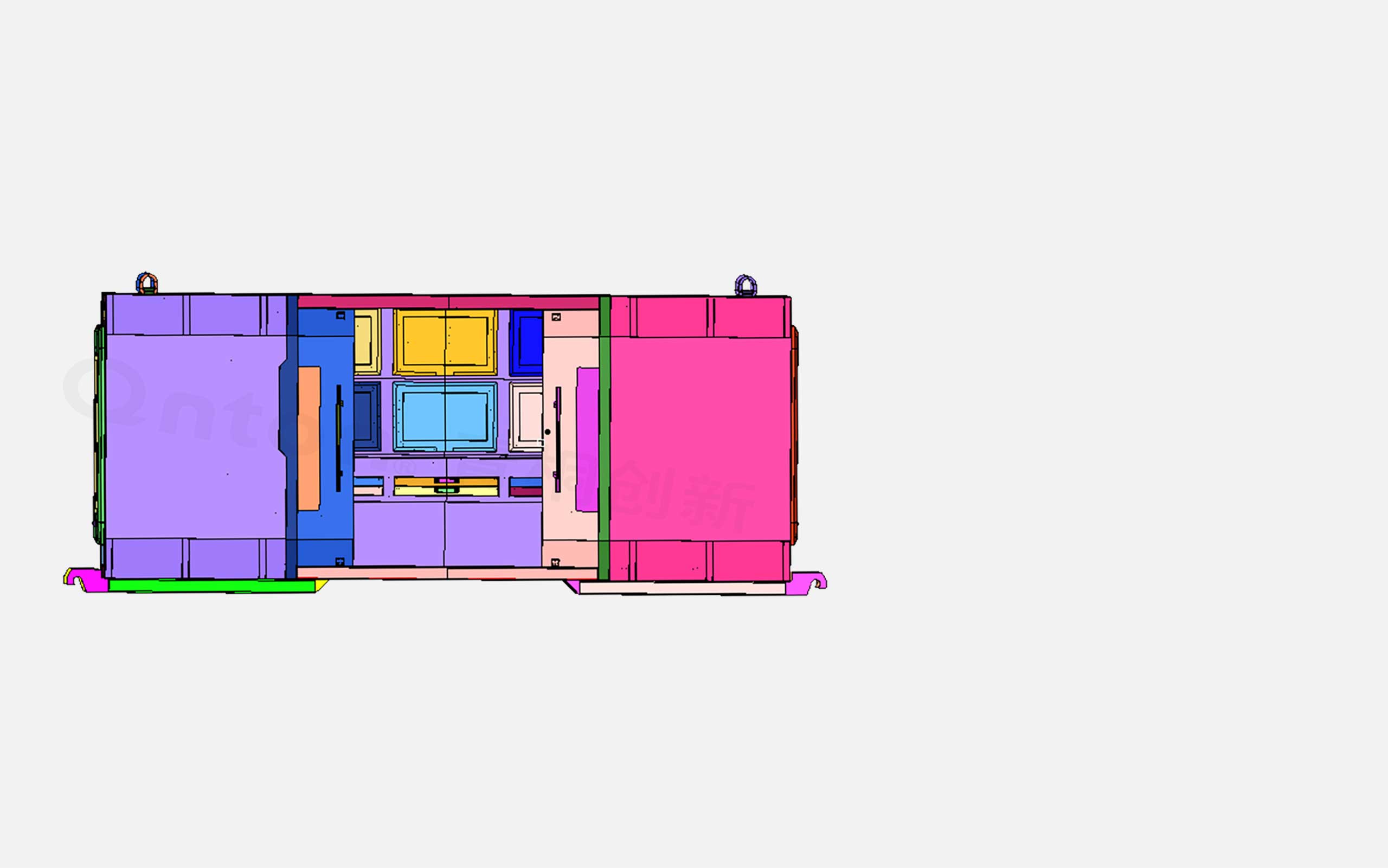根据客户要求,集控中心主体结构强度按照以下方面进行分析,分析过程将简化模型,建立有限元分析模型,并基于有限元分析模型,施加边界条件求解:1、分析100KG重物(煤块)从1M高位置落下,结构不能有明显的变形;2、分析计算控制台安装状态的变形量;3、分析计算上下吊耳在吊装过程中的强度满足要求;4、分析叉车装载过程中满足装载要求。