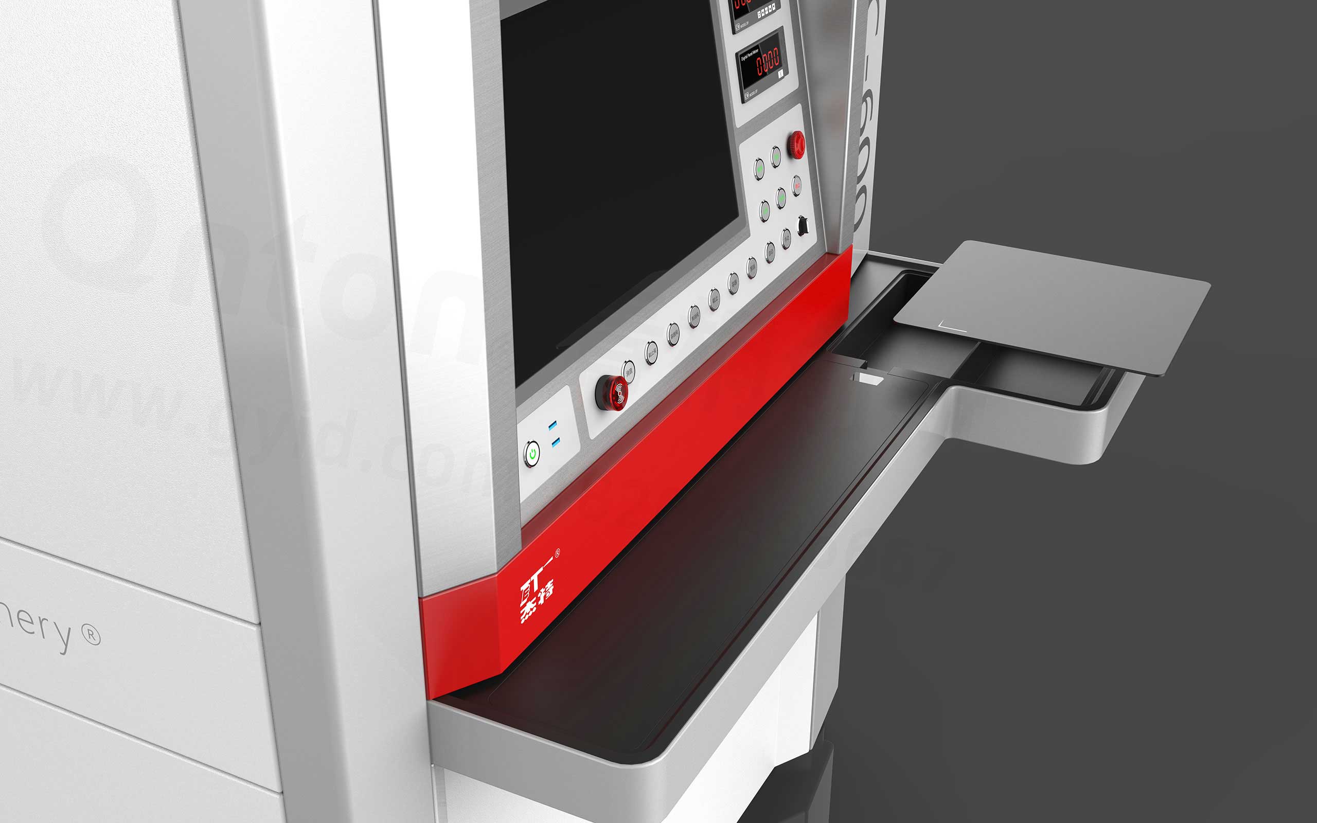 人机交互功能分区:显示屏幕置于左上方,电压、电流监控表置于右上方,电源和usb接口放置在左下方,操控按钮主要放置在右下方,打印机放置于右手边,方便拿取文件。各模块分区以浅色背景进行功能区分,形成一个舒适宜人操作的集成系统,有利于降低操作者的出错概率,提高生产效率。