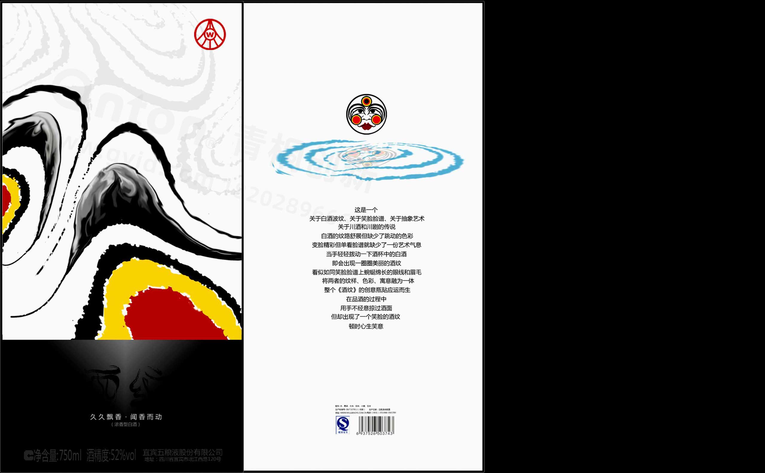 包装背景以泛黄的“宣纸”作为大色调,“黑和红”分别是川剧的变脸绝技和吐火绝技,酒盒顶盖和瓶贴正面酷似八卦图的纹样实则是把“八卦图”的中线换成了四川盆地内蜿蜒的“河流走势”,有了河才有水,水又是酒的灵魂,正是因为四川的好水才能酿造出如此美味的白酒。整个包装将显性元素的“川剧文化”和“中国书法”、隐性元素的“四川河流”和“八卦元素”融为一体,使之呈现出强烈的中国传统风格。