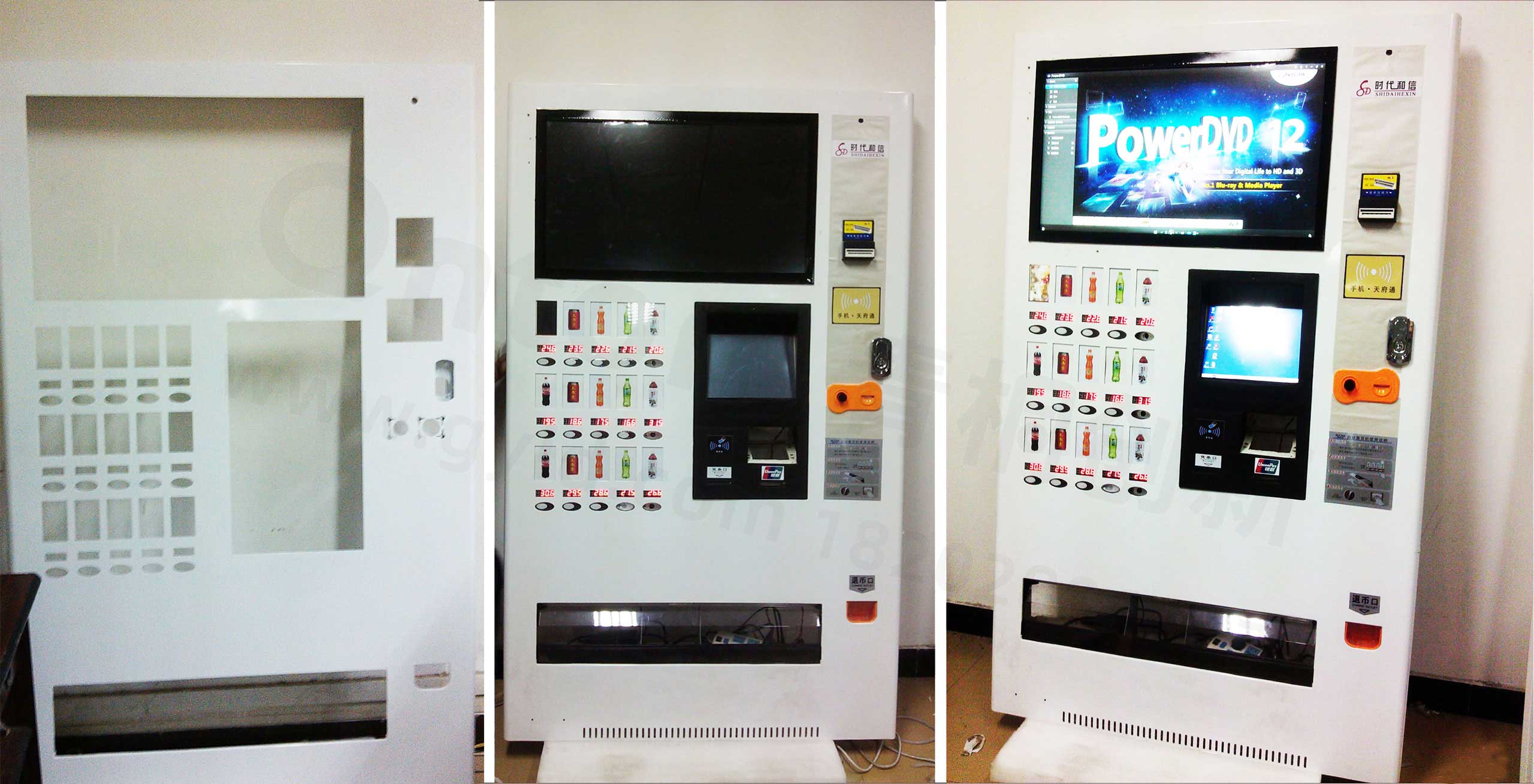 在设计过程中充分考虑到售卖机的使用环境、用户购买支付行为习惯,将自动售货机外形定义为简约、现代、紧凑造型。虚拟展示模块外框用贴纸的方式勾勒轮廓,中控采用塑料嵌件的安装方式实现,支付区亦采用贴纸的方式实现功能分区并体现整体感。