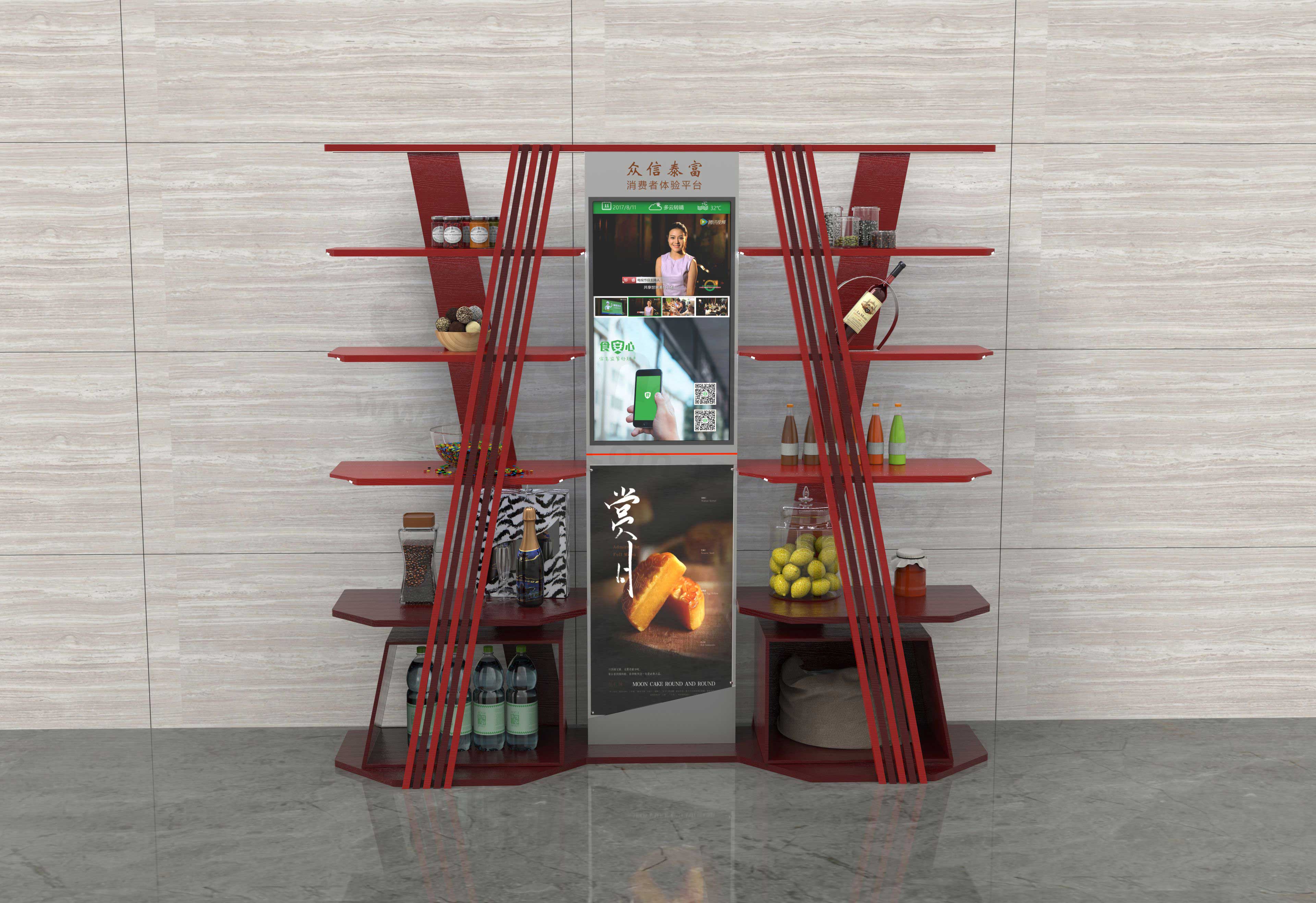 展示台采用木板拼接而成,开放式展示,用户可根据需要随意触摸产品、体验产品。在颜色搭配上,采用极具中国风的黑红搭配,符合中式饭店的环境,沉稳大气。