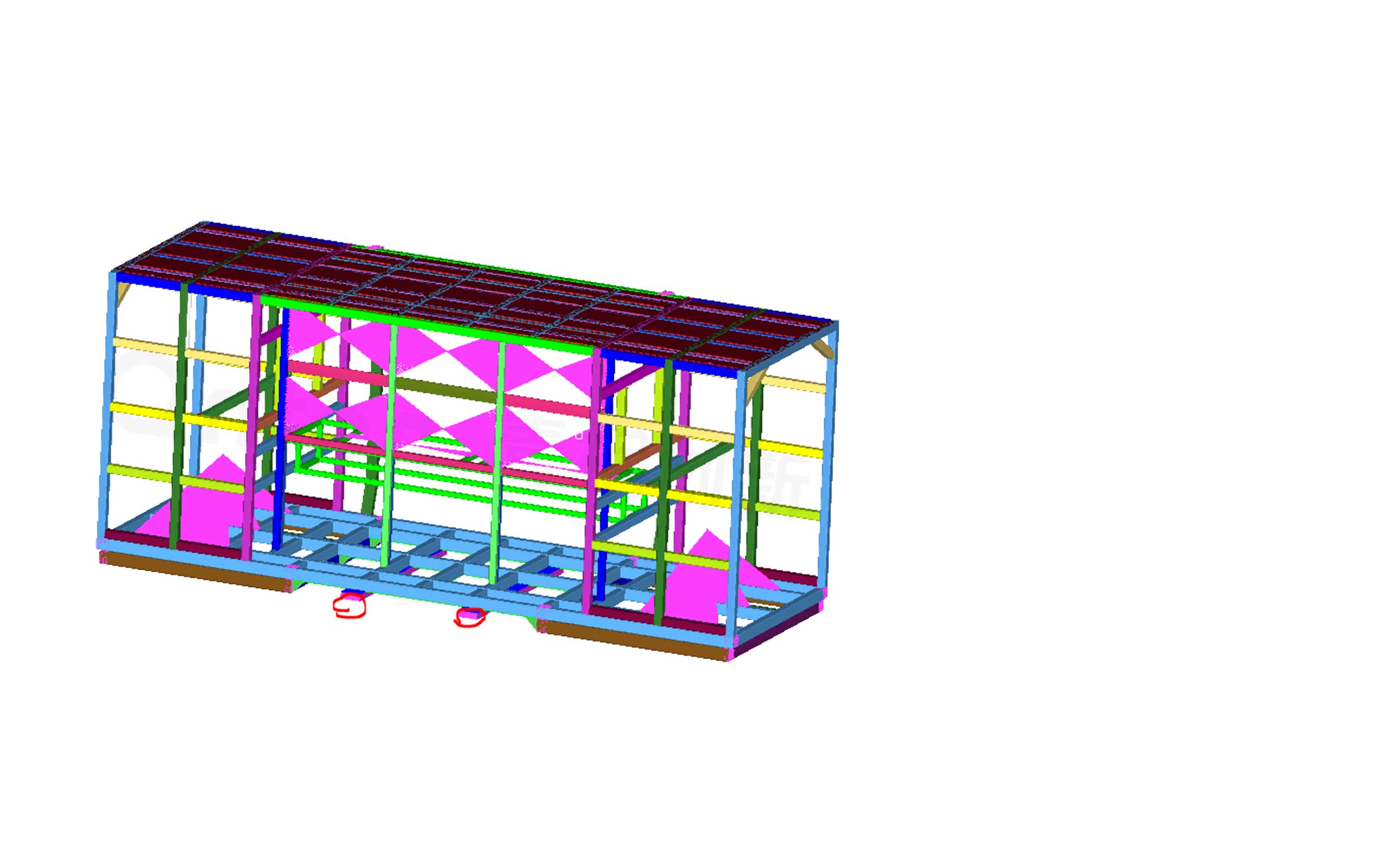根据客户要求,集控中心主体结构强度按照以下方面进行分析,分析过程将简化模型,建立有限元分析模型,并基于有限元分析模型,施加边界条件求解:1、分析100KG重物(煤块)从1M高位置落下,结构不能有明显的变形;2、分析计算控制台安装状态的变形量;3、分析计算上下吊耳在吊装过程中的强度满足要求;4、分析叉车装载过程中满足装载要求。